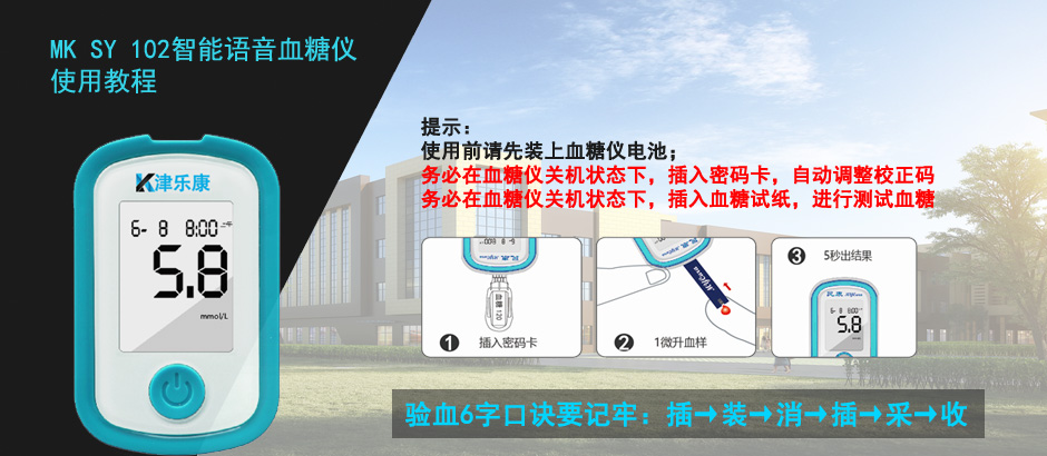 民康MK SY102智能語音血糖儀使用教程,提示: 使用前請(qǐng)先裝上血糖儀電池; 務(wù)必在血糖儀關(guān)機(jī)狀態(tài)下,插入密碼卡,自動(dòng)調(diào)整校正碼 務(wù)必在血糖儀關(guān)機(jī)狀態(tài)下,插入血糖試紙,進(jìn)行測(cè)試血糖